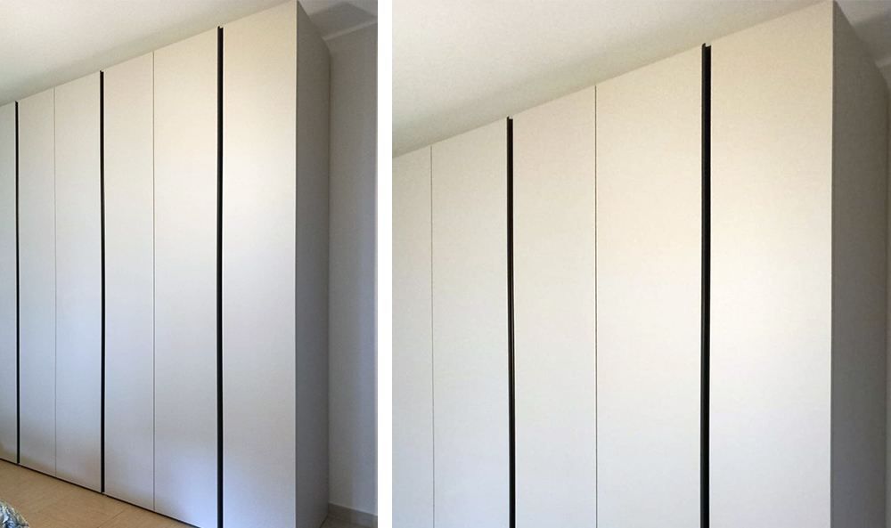 Composizione di armadi con gola o maniglia adattabili ai diversi spazi con possibilità di sfruttare l’altezza del locale.